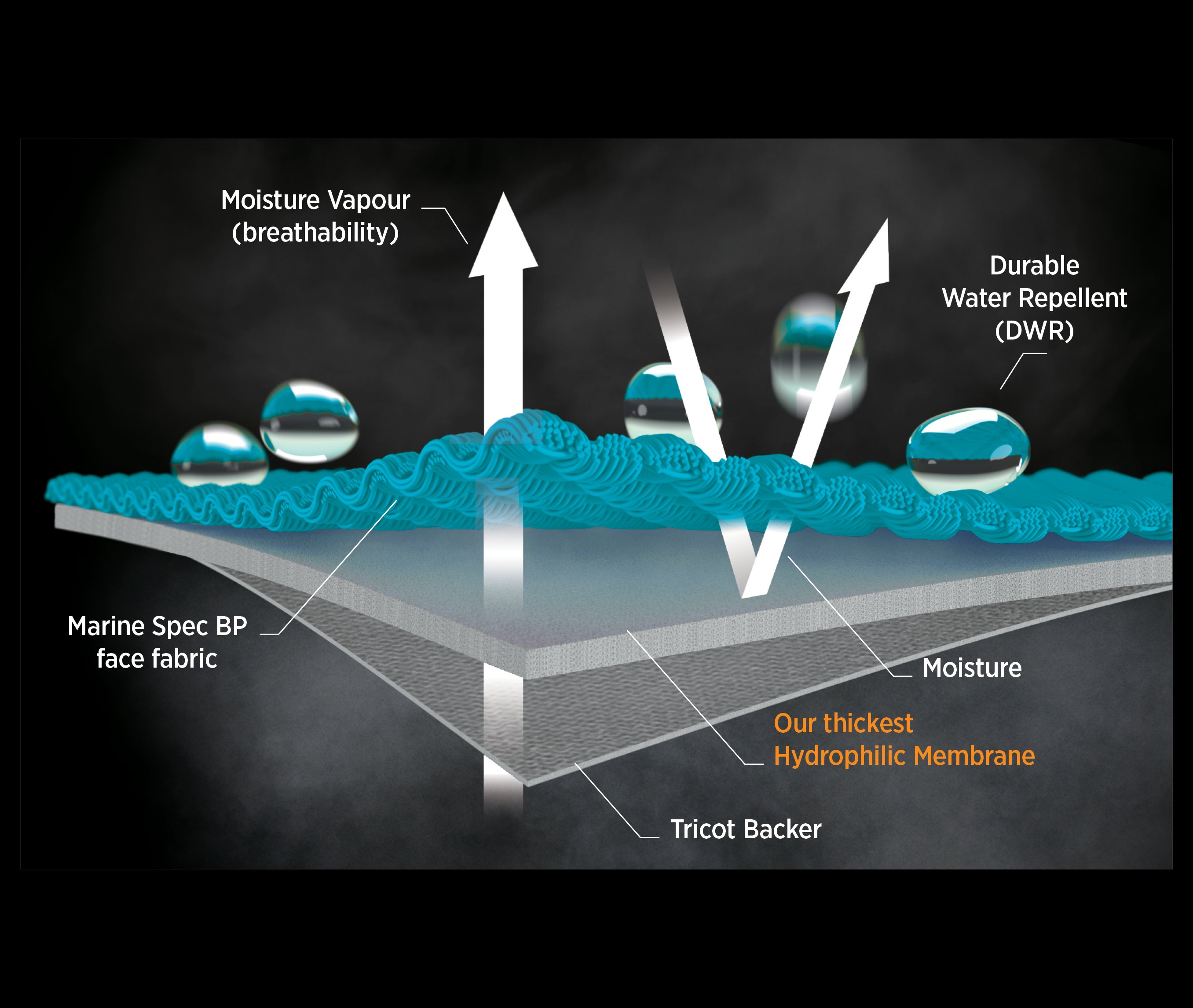 Benchmarked with Mil Spec 6.5 with Gore-Tex, Marine Spec BP features abrasion, salt water, and UV, resistant 70D nylon. Its bi-component membrane, hydrophilic PU membrane, and PFC-free hydrophobic PU coating ensure top breathability, waterproofing, and windproofing. A nylon tricot backer adds next-to-skin comfort. Find this 195 gsm fabric in our coastal and offshore apparel and drysuits. Learn More.